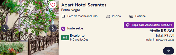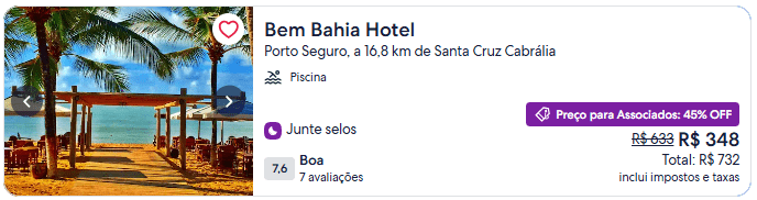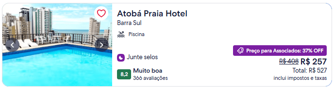 Entre as ofertas verificadas, há 47% de desconto no Apart Hotel Serantes, em Natal, 45% no Bem Bahia Hotel, em Porto Seguro, 37% no Atobá Praia Hotel, e 31% off na Pousada Makai em Ipojuca.