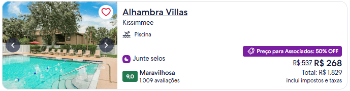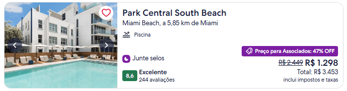 Quem pretende viajar para fora do país também encontra oportunidades expressivas. O Alhambra Villas, em Kissimmee, está com 50% de desconto e o Park Central South Beach, em Miami, com 47%.