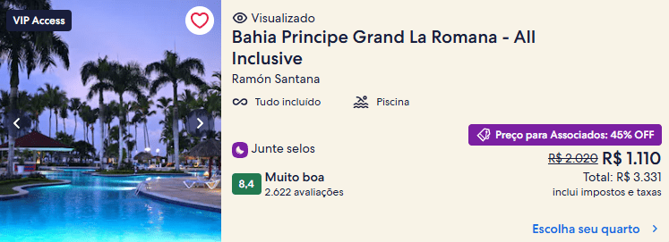 O Casa de Campo Resort and Villas ou o Bahia Principe Grand La Romana – All Inclusive, na República Dominicana, estão com 70 e 45% de desconto, respectivamente, e o Park Plaza Santiago, 4 estrelas, com 49%.