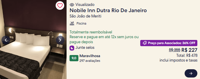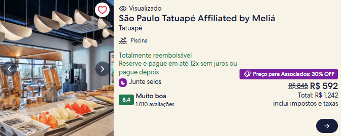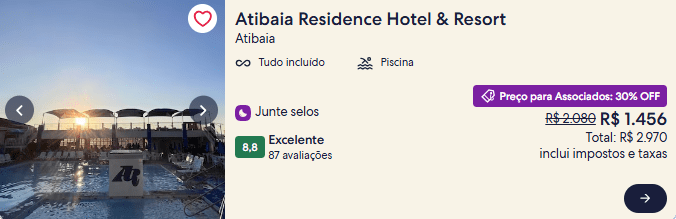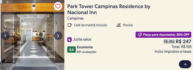 Entre as ofertas verificadas, há 36% de desconto no Nobile Inn Dutra Rio De Janeiro; e 30% no Park Tower Campinas Residence by Nacional Inn, no Atibaia Residence Hotel & Resort e no São Paulo Tatuapé Affiliated by Meliá.