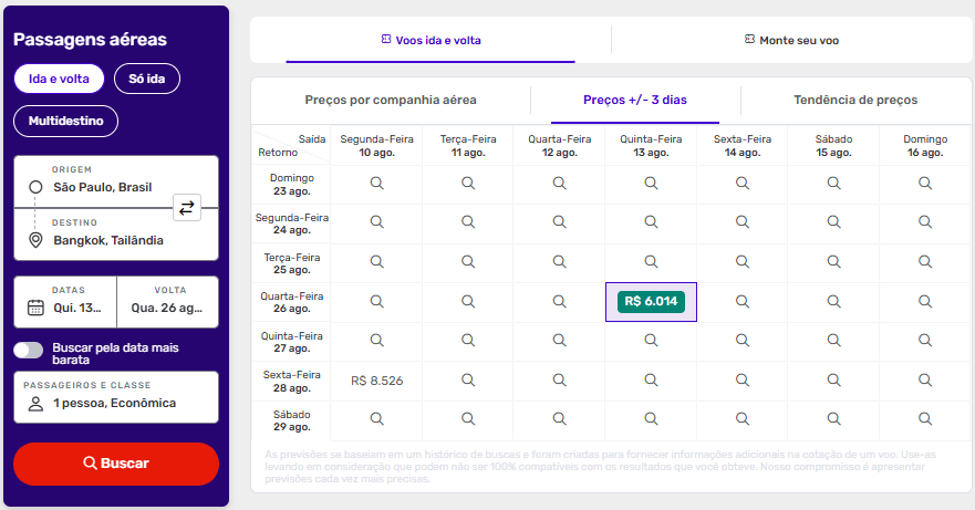Faça sua busca e clique em “Preços +/- 3 dias” que um calendário com combinações de datas com as melhores ofertas irá se abrir.