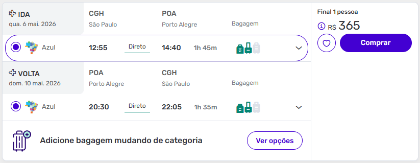 São Paulo (CGH – Congonhas) → Porto Alegre (POA) a partir de R$ 365 ida e volta com taxas inclusas.