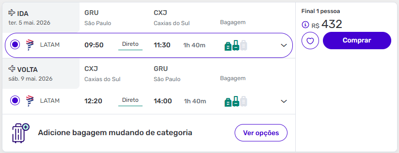 São Paulo (GRU – Guarulhos) → Caxias do Sul (CXJ) a partir de R$ 432 ida e volta com taxas inclusas.