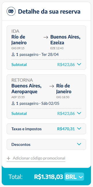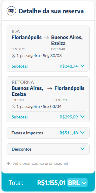 Os preços foram encontrados para voos saindo de Florianópolis e Rio de Janeiro, com chegada em Buenos Aires (Ezeiza). Como acontece nesse tipo de oferta, os valores variam conforme a data escolhida e a disponibilidade de assentos.