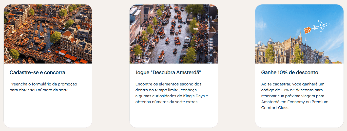 A KLM lançou uma campanha promocional voltada ao público brasileiro que combina entretenimento e turismo. A iniciativa, chamada “Descubra Amsterdã”, permite que os participantes joguem online e concorram a uma viagem com acompanhante para a capital dos Países Baixos durante o famoso King’s Day, uma das maiores celebrações do país.