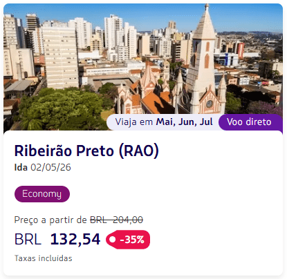 - São Paulo → Ribeirão Preto (RAO) a partir de R$ 132 o trecho, já com taxas inclusas