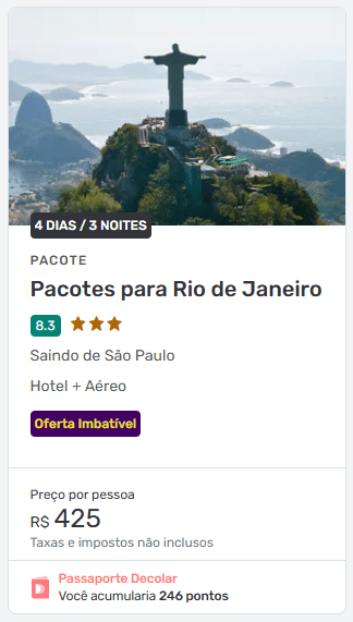 Pacote para o Rio de Janeiro (4 dias / 3 noites) em hospedagem bem avaliada (nota 8.3) com passagens aéreas de ida e volta saindo de São Paulo a partir de R$ 425 por pessoa + taxas, muito barato! E esse é só um exemplo.