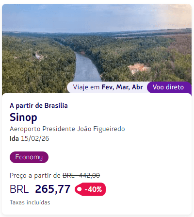 Além dos 46% citados acima, ainda há descontos expressivos na página da promoção LATAM, como, por exemplo, o voo de Brasília para Sinop, com 40% off.