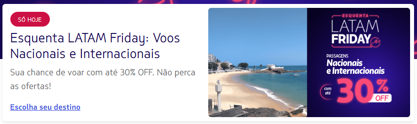 A LATAM lançou hoje o Esquenta LATAM Friday, promoção relâmpago de apenas 7 horas, com passagens aéreas nacionais a partir de R$ 123,77 o trecho com taxas inclusas, e descontos de até 46% (apesar do banner informar que são descontos de até 30).