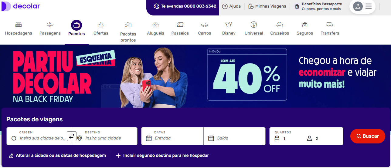 Além da promoção relâmpago da LATAM, a Decolar está com o esquenta Black Friday, oferecendo até 40% de desconto em hotéis e resorts, além de ofertas imperdíveis em passagens e pacotes de viagem.