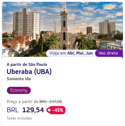 Em buscas recentes aparecem passagens aéreas a partir de R$ 129 por trecho, com diversas rotas promocionais dentro do Brasil e também para destinos da América do Sul.