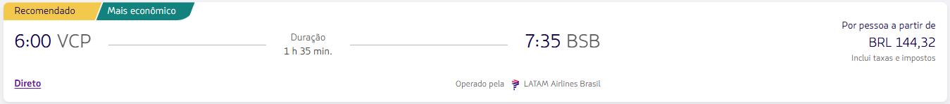 - Campinas (VCP) → Brasília (BSB): a partir de R$ 144,32