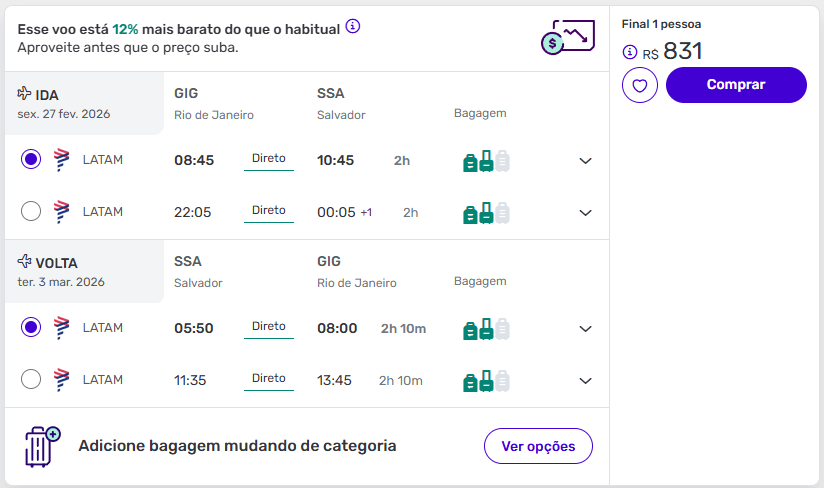 Rio de Janeiro → Salvador a partir de R$ 831 ida e volta