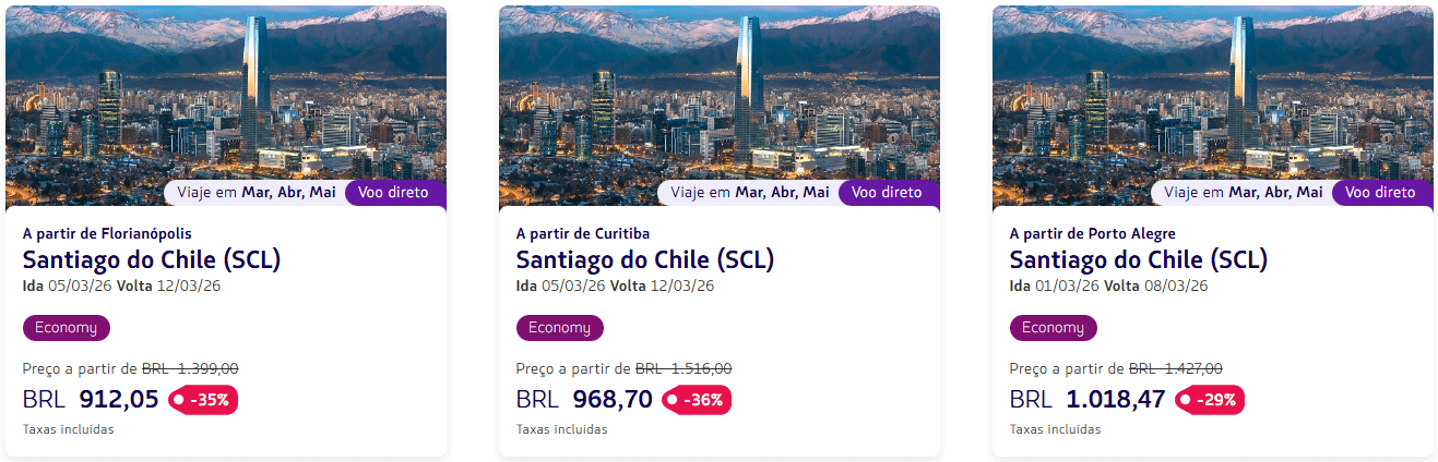 - Porto Alegre → Santiago (SCL) — a partir de R$ 1.018,47