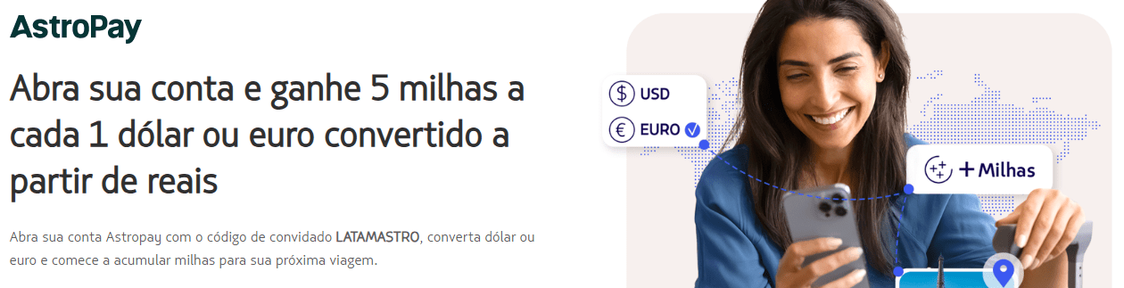 Uma nova oportunidade interessante para acumular milhas sem precisar voar apareceu no programa LATAM Pass. Em parceria com a AstroPay, a campanha permite ganhar milhas ao simplesmente converter reais em dólar ou euro — algo que muita gente já faz ao planejar uma viagem internacional.