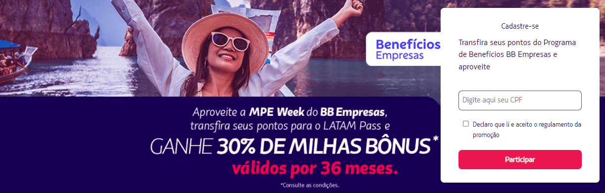 A oferta é válida para todos os clientes LATAM Pass. São 30% de milhas bônus nas transferências de pontos BB Empresas para o LATAM Pass.
