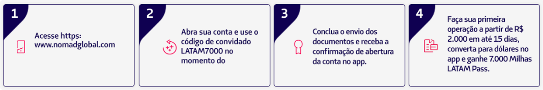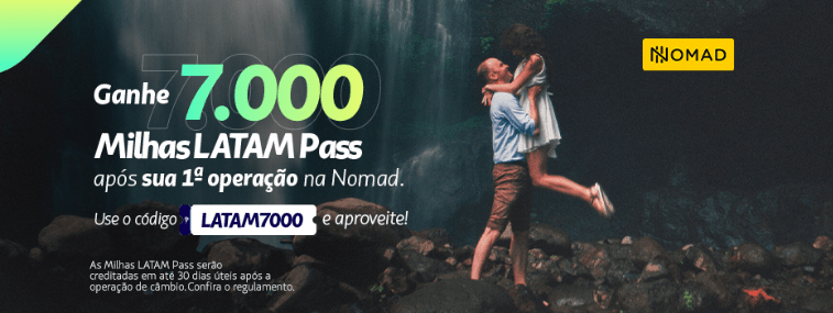 A Nomad lançou uma campanha em parceria com o LATAM Pass que oferece 7.000 Milhas LATAM Pass como bônus para novos clientes que abrirem conta e realizarem sua primeira operação de câmbio.