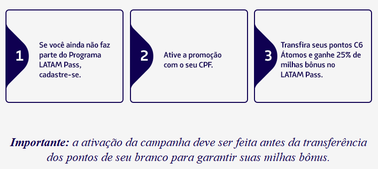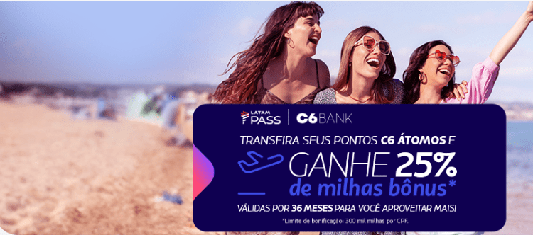 A oferta é válida para todos os clientes LATAM Pass. São 25% de milhas bônus* nas transferências de pontos C6 Átomos para o LATAM Pass.
