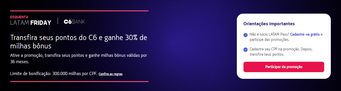 A oferta é válida para todos os clientes LATAM Pass. São 30% de milhas bônus* nas transferências de pontos C6 Átomos para o LATAM Pass.