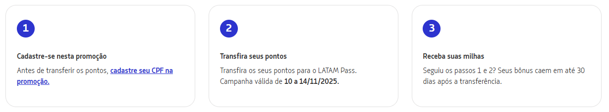 - Prazo de validade dos pontos transferidos e bônus: 36 meses, a partir da data de crédito em conta. A validade é renovada automaticamente a cada voo realizado com a LATAM.