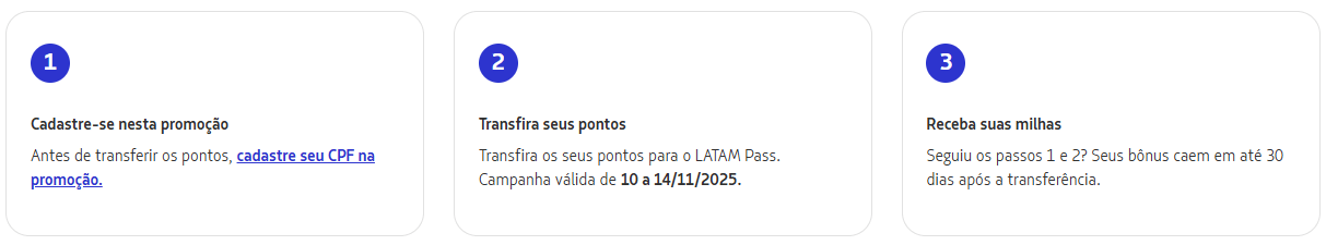 - Prazo de validade dos pontos transferidos e bônus: 36 meses, a partir da data de crédito em conta. A validade é renovada automaticamente a cada voo realizado com a LATAM.
