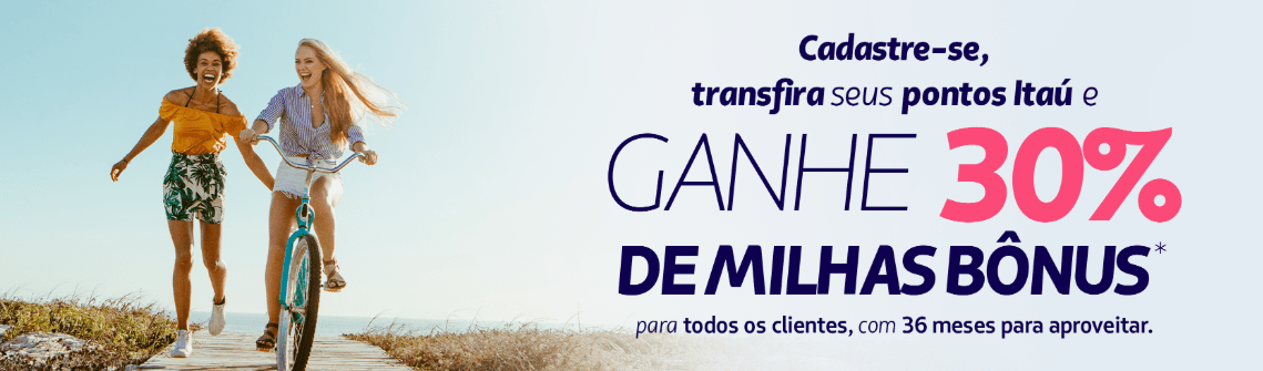 A oferta é válida para todos os clientes LATAM Pass. São 30% de milhas bônus* nas transferências de pontos Itaú para o LATAM Pass.