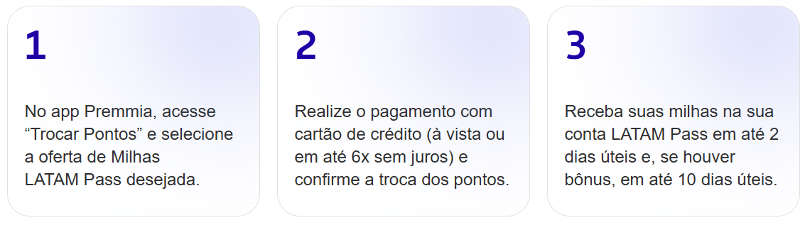 - Somente os pontos convertidos pelo app Premmia podem ser trocados por Milhas LATAM Pass. As milhas recebidas seguem as regras de validade do programa LATAM Pass e, após a transferência, não é possível reverter a operação.