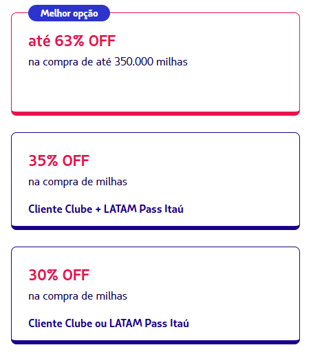 - Até 63% de desconto: para clientes Clube + Cartão LATAM Pass Itaú