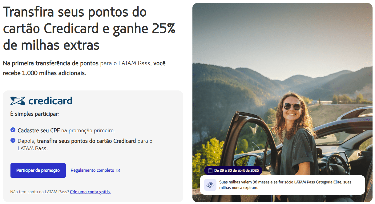- Conversão mantida: 1 ponto Credicard = 1 milha LATAM Pass