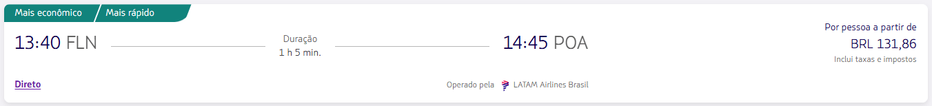 Imagem: reprodução do site da LATAM em 26/01/2026 com o trecho mais barato (FLN/POA por R$ 131,86).