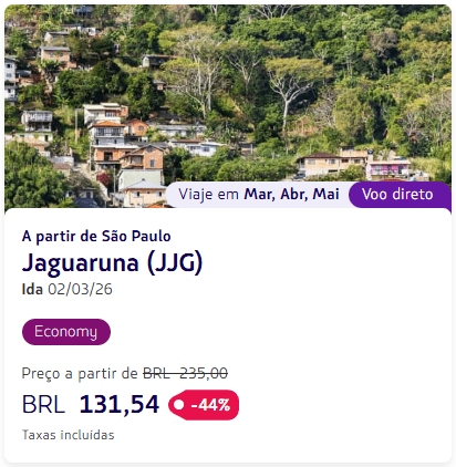 O trecho mais barato é de São Paulo para Jaguaruna como é possível ver na imagem, acima, do site da companhia, mas existem vários outros com preços bem interessantes.