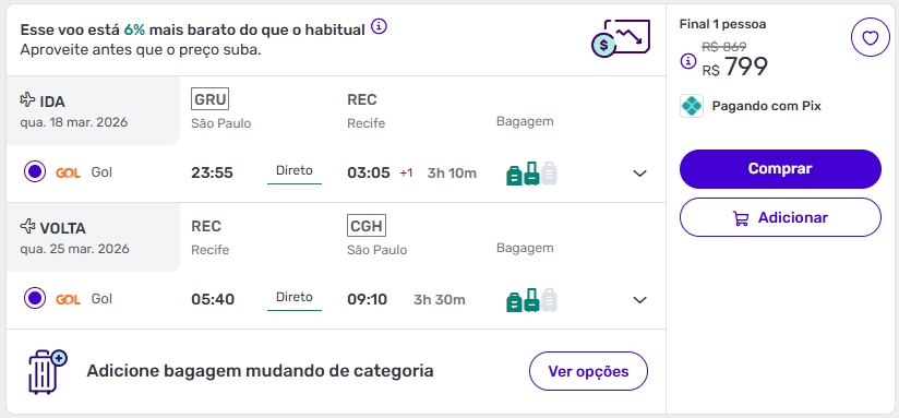 Acabamos de encontrar estas passagens aéreas GOL na Decolar, saindo de São Paulo (GRU) para Recife (REC) a partir de R$ 799 ida e volta com taxas inclusas pagando no Pix, usando o calendário de ofertas da Decolar.