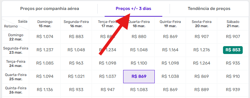Acesse o site da Decolar e faça sua busca inserindo origem/destino e datas, nos resultados da pesquisa clique em “PREÇOS +/- 3 DIAS” que um calendário irá se abrir com combinações de datas com as melhores ofertas.