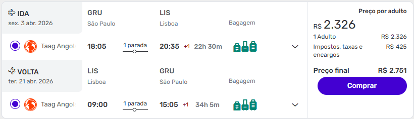 São Paulo para Lisboa a partir de R$ 2.751 ida e volta com taxas e bagagens inclusas