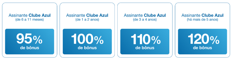 O percentual máximo, no entanto, aparece quando entram os bônus adicionais por tempo de assinatura no Clube Azul, que são cumulativos: