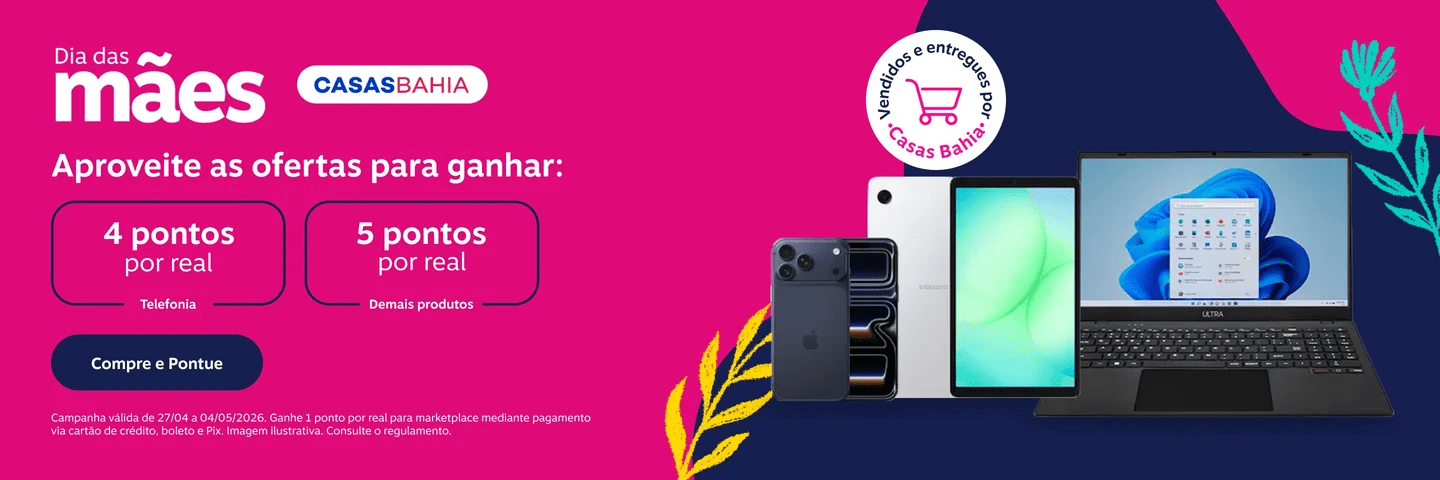 Casas Bahia: 4 pontos por real gasto na categoria de Telefonia; 5 pontos por real nos demais produtos vendidos e entregues por Casas Bahia e 1 ponto por real para marketplace mediante pagamento via cartão de crédito, boleto e Pix.