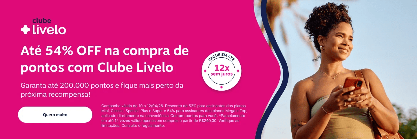 Se a ideia é acelerar o acúmulo de pontos e transformar planos de viagem em realidade mais rápido, essa pode ser uma daquelas oportunidades que merecem atenção. A Livelo lançou uma campanha com até 54% de desconto na compra de pontos, válida por poucos dias e com condições diferenciadas para assinantes do clube.