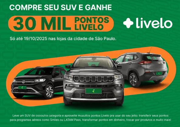 Sim! Para quem já pensa em trocar de carro e busca um SUV seminovo, essa é uma boa oportunidade de unir a compra do veículo ao acúmulo de pontos Livelo — que podem ser utilizados em viagens, produtos e até pagamentos do dia a dia.
