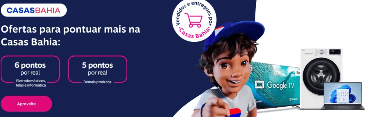 Casas Bahia: 6 pontos por real gasto nas categorias de eletrodoméstico, telas e informática; 5 pontos por real nos demais produtos vendidos e entregues por Casas Bahia e 1 ponto por real para marketplace mediante pagamento via cartão de crédito, boleto e Pix.