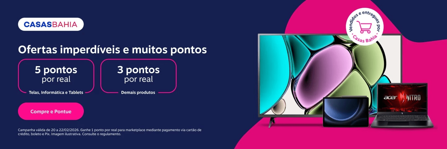 Casas Bahia: 5 pontos por real gasto nas categorias de eletrodomésticos, áudio e informática; 4 pontos por real nos demais produtos vendidos e entregues por Casas Bahia e 1 ponto por real para marketplace mediante pagamento via cartão de crédito, boleto e Pix.