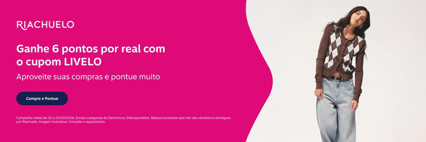 Riachuelo: 6 pontos a cada real gasto. Exceto categorias de eletrônicos, eletroportáteis, beleza e produtos que não são vendidos e entregues por Riachuelo.