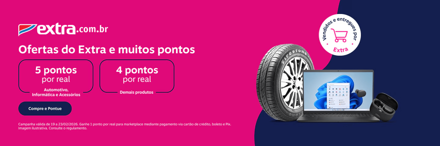 Extra: 5 pontos por real gasto nas categorias de automotivo; informática e acessórios; 4 pontos por real gasto nos demais produtos vendidos e entregues por Extra e 1 ponto por real para marketplace mediante pagamento via cartão de crédito, boleto e Pix.