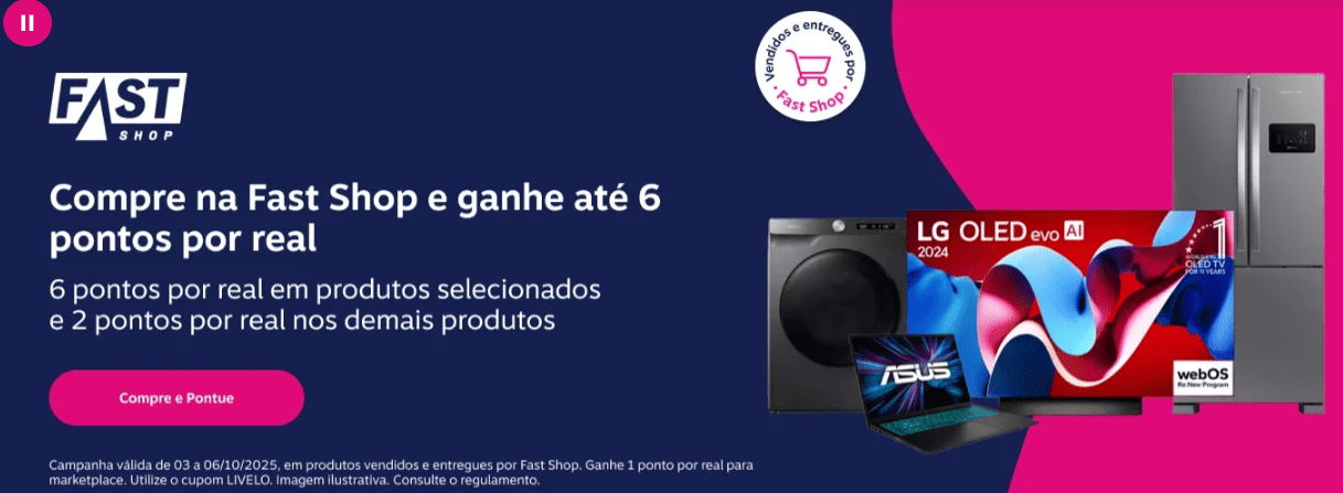 Fast Shop: 6 pontos por real gasto em produtos selecionados; 2 pontos por real nos demais itens vendidos e entregues por Fast Shop e 1 ponto por real para marketplace.