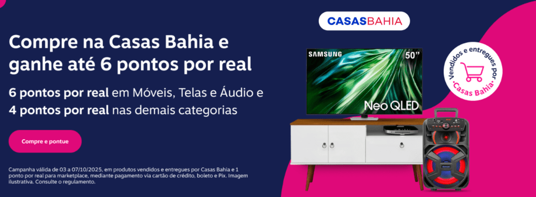 Casas Bahia: 6 pontos por real gasto nas categorias de móveis, telas e áudio; 4 pontos por real nos demais produtos vendidos e entregues por Casas Bahia e 1 ponto por real para marketplace mediante pagamento via cartão de crédito, boleto e Pix.
