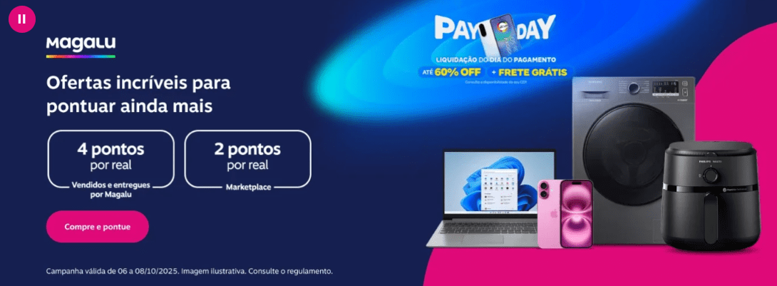 Magalu: 4 pontos por real gasto em produtos vendidos e entregues por Magalu e 2 pontos por real para marketplace.