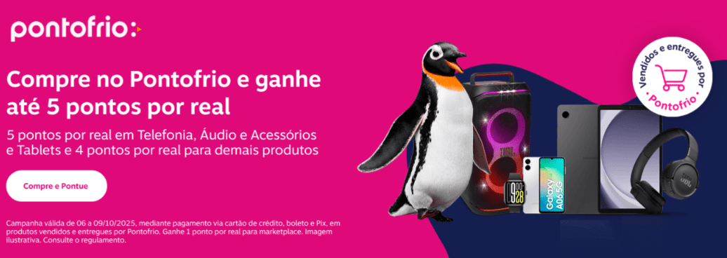 Ponto Frio: 5 pontos por real gasto nas categorias de telefonia, áudio e acessórios e tablets; 4 pontos por real nos demais produtos vendidos e entregues por Pontofrio e 1 ponto por real para marketplace mediante pagamento via cartão de crédito, boleto e Pix.