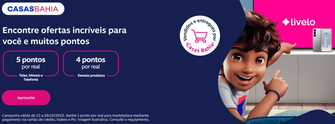Casas Bahia: 5 pontos por real em telas, móveis e telefonia, e 4 pontos por real de itens vendidos e entregues pela Casas Bahia. 1 ponto por real em produtos do marketplace.