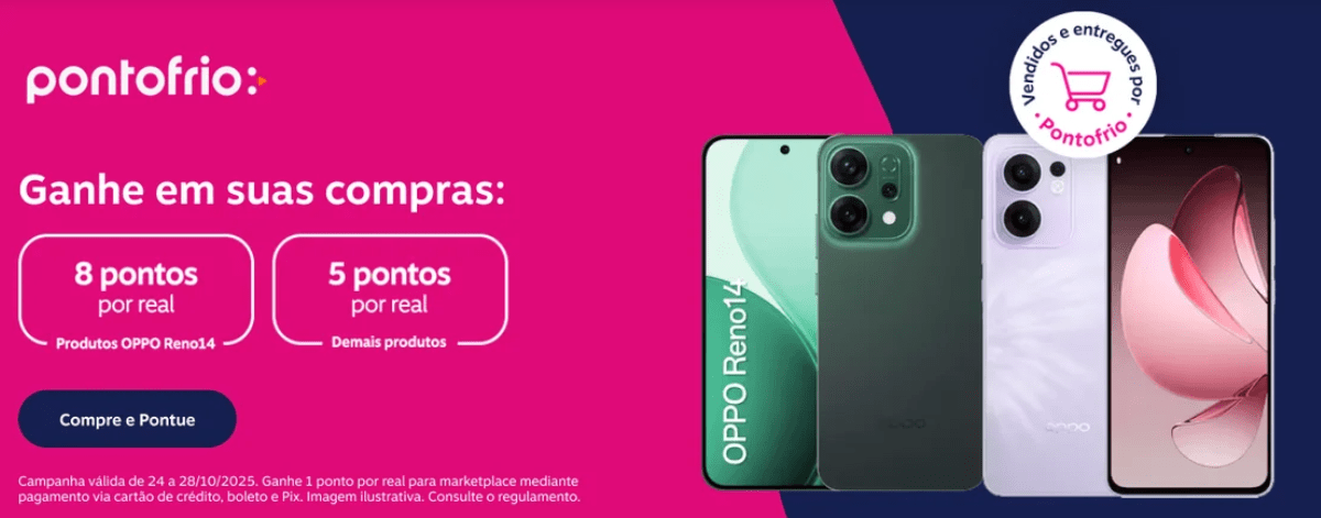Ponto Frio: 8 pontos por real gasto nos produtos OPPO Reno14; 5 pontos por real nos demais produtos vendidos e entregues por Pontofrio e 1 ponto por real para marketplace mediante pagamento via cartão de crédito, boleto e Pix.