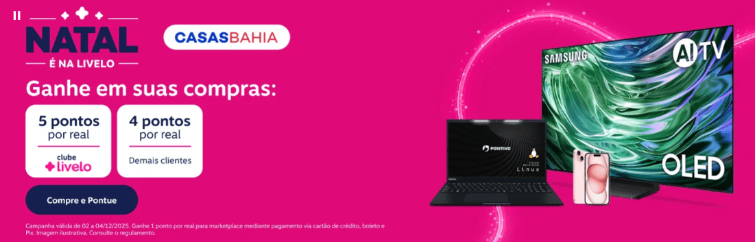 Casas Bahia: 5 pontos por real gasto exclusivo para assinantes Clube Livelo; 4 pontos por real para demais clientes em produtos vendidos e entregues por Casas Bahia e 1 ponto por real para marketplace mediante pagamento via cartão de crédito, boleto e Pix.