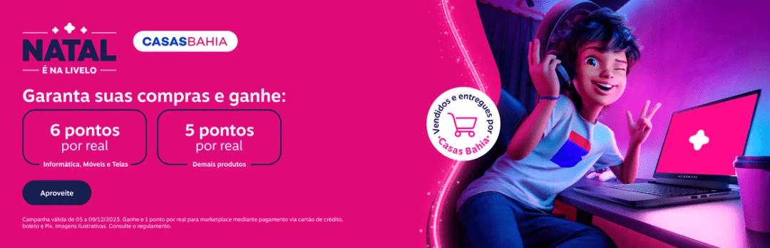 Casas Bahia: 6 pontos por real gasto nas categorias de informática, móveis e telas; 5 pontos por real nos demais produtos vendidos e entregues por Casas Bahia e 1 ponto por real para marketplace mediante pagamento via cartão de crédito, boleto e Pix.